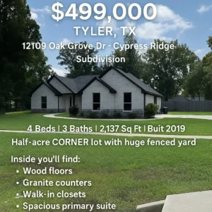 Looking for a spacious, modern home in Tyler, TX? This beautiful 4-bedroom, 3-bathroom single-family residence at 12109 Oak Grove Dr, Tyler, TX 75706 offers the perfect blend of comfort, style, and convenience. Built in 2019 and situated on a half-acre corner lot, this property is a rare find in the desirable Cypress Ridge subdivision.